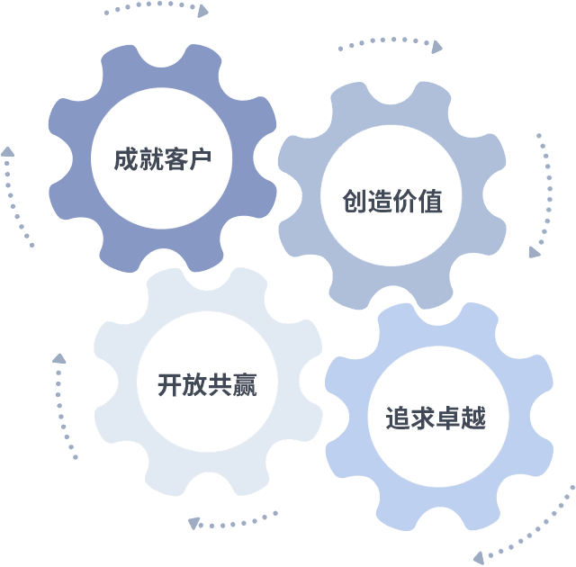 成就客户是一切决策的出发点,,,,创造价值是衡量所有工作的标准,,,,追求卓越是我们做事做人的态度,,开放共赢是我们的格局也是最终的结果。。。价值观的齿轮环环相扣,,,推动着组织里的每个人不断向前。。。。